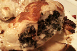 Once you have the chickens stuffed, align them on your platter and drizzle them with the alfredo sauce. Once drizzled, bake for 35 minutes (give or take, depending on the size of chicken). Sprinkle with mozzarella and bake for another 5 minutes.